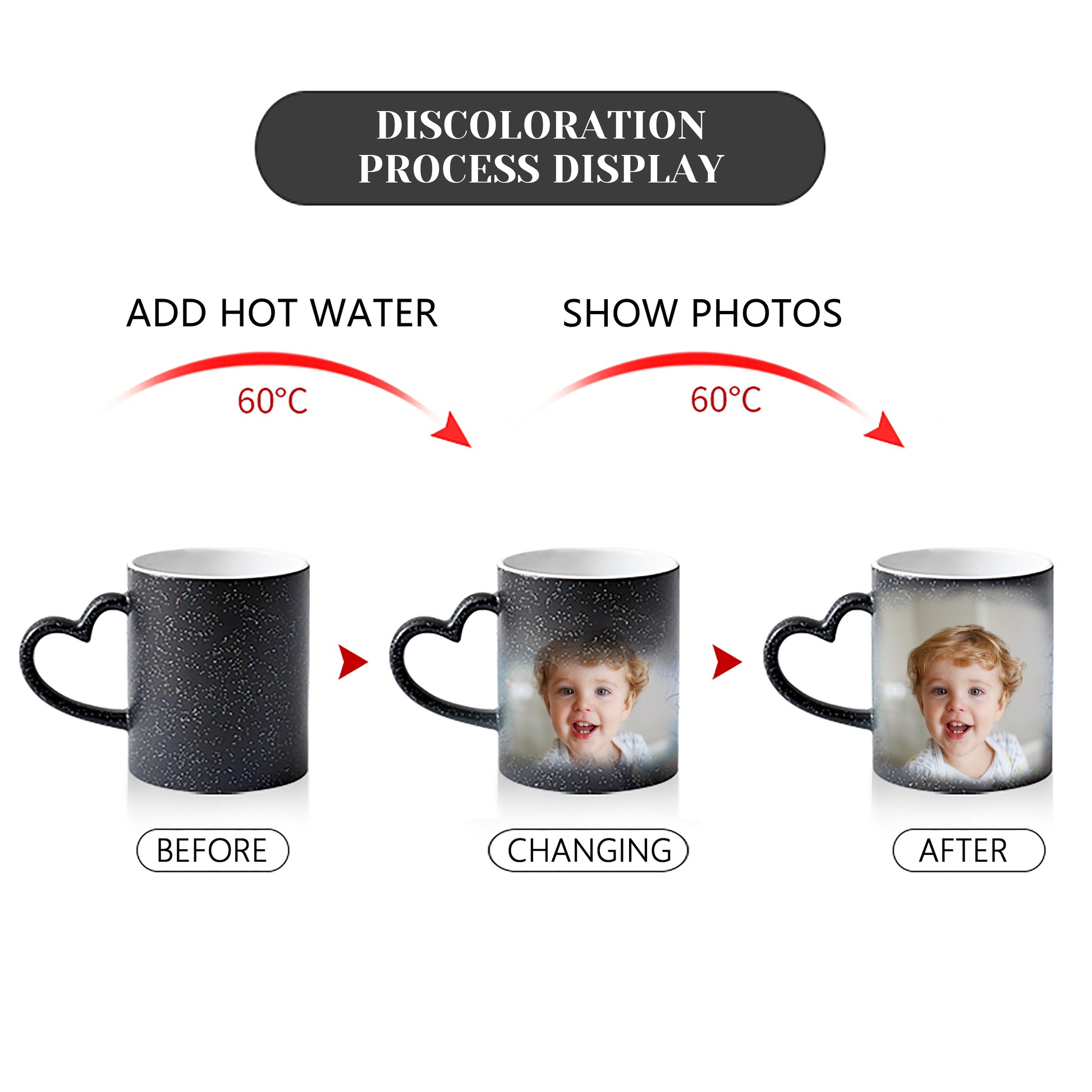 • Color Change - Heat sensitive mug, the mug is black when its cold, when pour in hot liquid, it will turn white and your image appears.